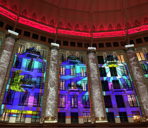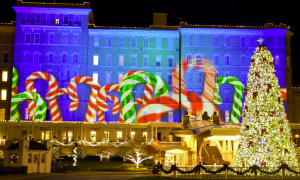 projectors and 3D animation transform the exterior of French Lick Springs Hotel into vibrant holiday scenes. Holiday sounds fill the air as the building seems to magically come to life in each eight-minute show.